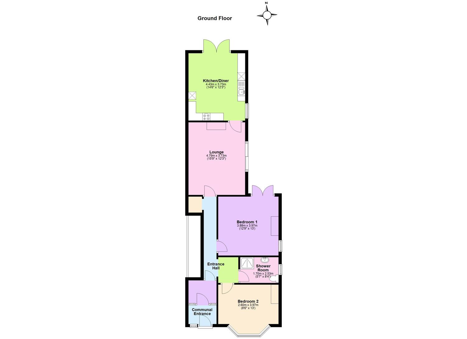 Internally, the flat offers spacious and thoughtfully arranged accommodation. At the front, you’ll find two double bedrooms, both with good proportions, with the master bedroom benefiting from a charming bay window that adds character and floods the room with natural light. The contemporary shower room is also located to the front of the property, serving both bedrooms conveniently.