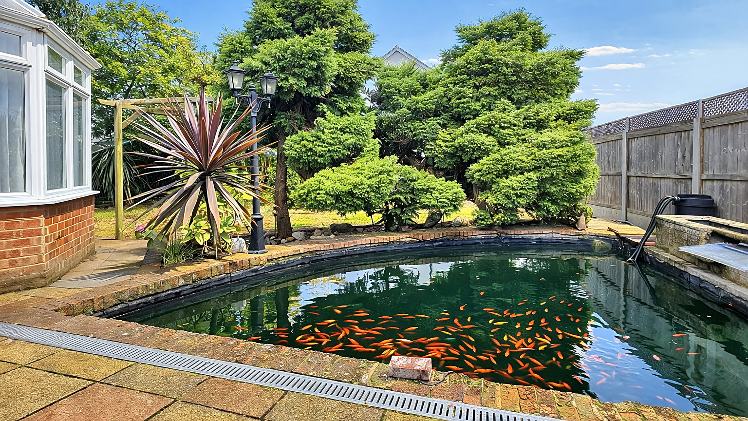 Outside, the property boasts well-maintained gardens to the front and rear. The rear garden is a true highlight, featuring a lovely fish pond and providing access to the garage. The garage, situated at the rear, also includes a driveway with parking for two cars, ensuring plenty of space for family or guests.