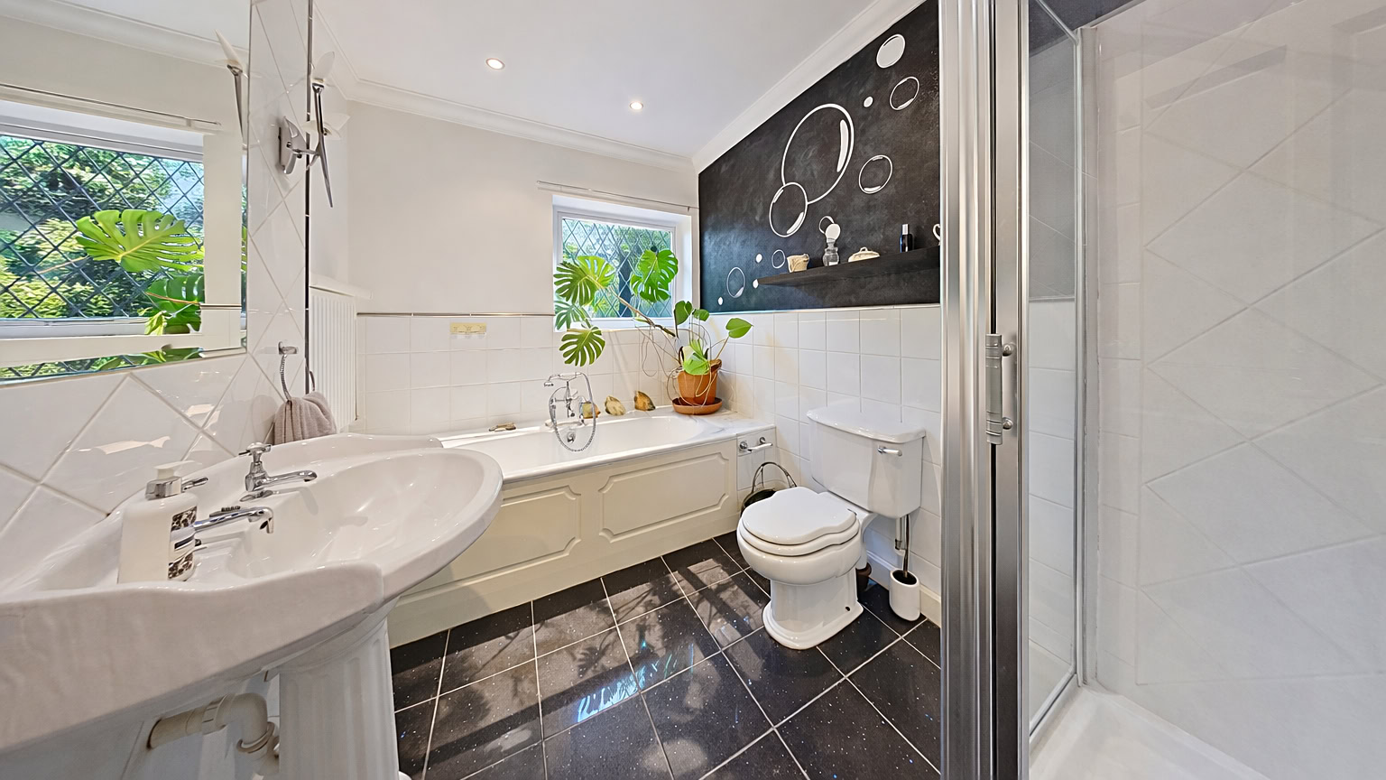 Stepping into the spacious entrance hall, you are immediately struck by the sense of scale and light that continues throughout the property. To the left, the large master bedroom enjoys its own private ensuite shower room, providing a peaceful and well-appointed retreat. Directly opposite lies the second double bedroom, with a third room beyond that offers versatility as either a fourth bedroom or a dedicated home office—ideal for remote working or visiting guests.
