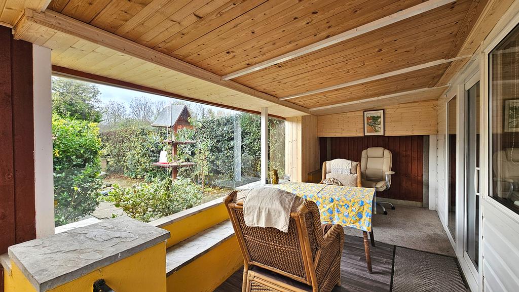 While the property is in need of some modernisation, it provides a generous and flexible layout that would lend itself beautifully to refurbishment. Upon entering, you are welcomed by a spacious porch which leads into the main entrance hall. A large lounge offers a comfortable living space, with the adjacent kitchen providing a practical setup that could be reimagined as an open-plan hub of the home. Both rooms lead seamlessly into a second reception area, currently set up as a dining room, but equally suitable as a family room, playroom, or snug. From here, doors open out to a covered seating area, perfect for enjoying the garden in all seasons.