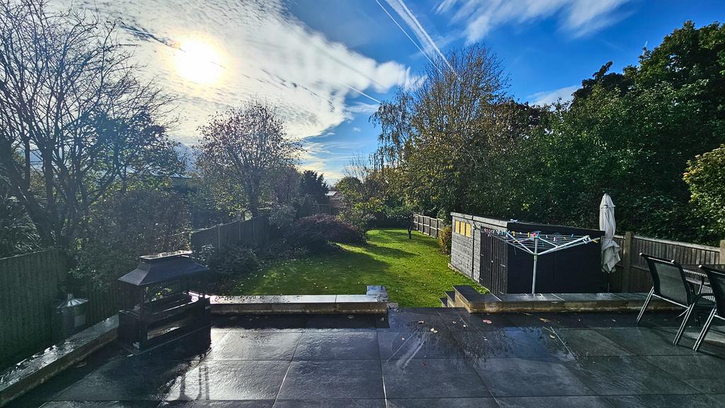 Externally, the property continues to impress. The large rear garden is perfect for family life and outdoor entertaining, featuring a patio area ideal for summer dining and side access for added convenience. To the front, a smaller lawned garden is complemented by a long driveway that offers off-road parking for several vehicles.