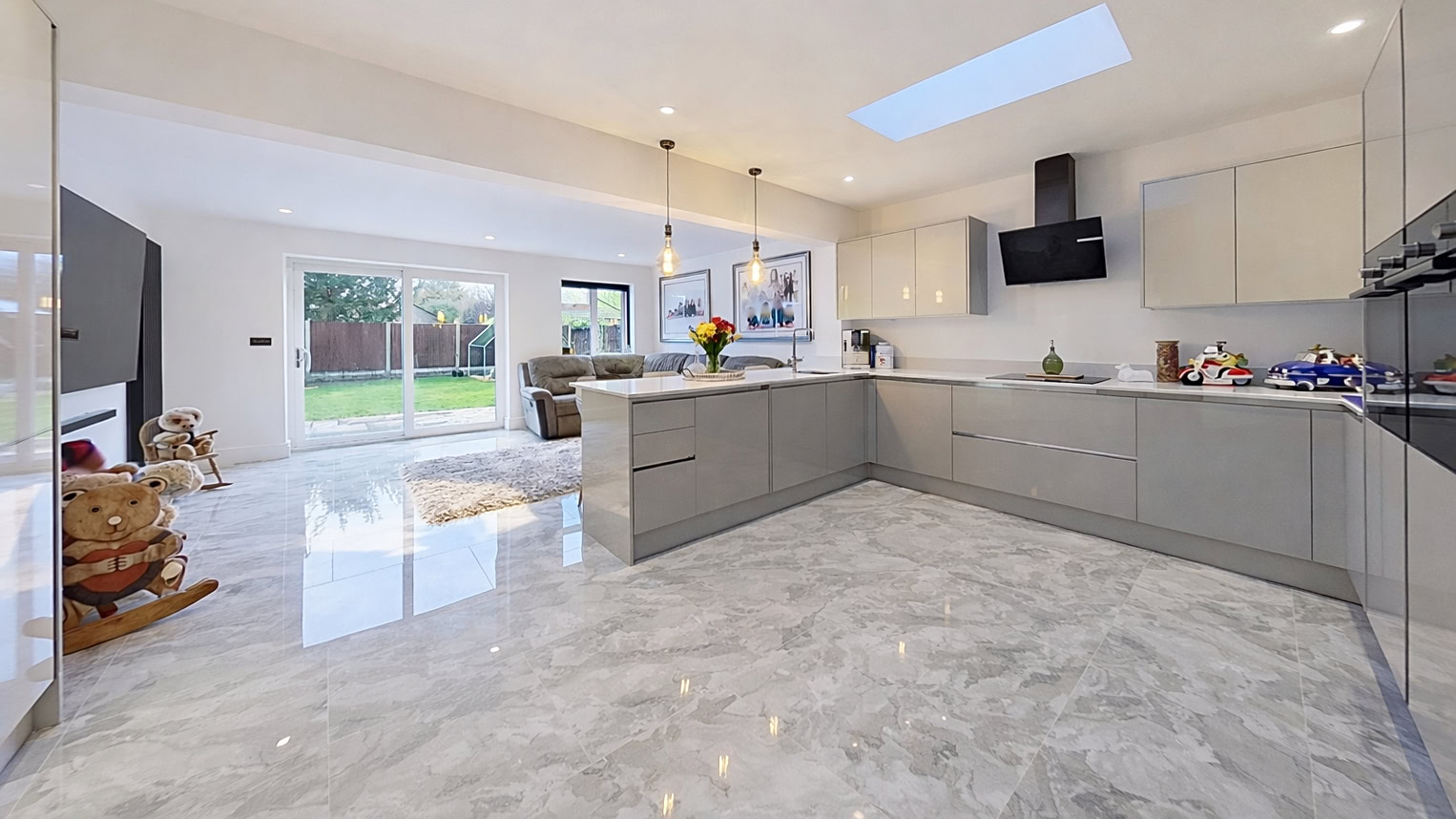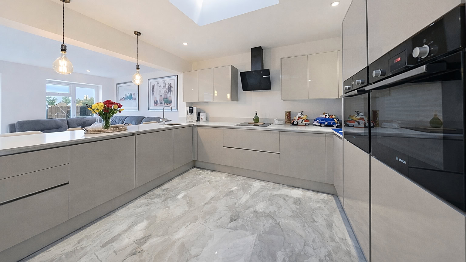 Situated on the ever-popular Savernake Drive in Herne Bay, this beautifully presented three bedroom semi-detached bungalow has been thoughtfully extended and comprehensively modernised by the current owners to create a stylish and versatile home. The heart of the property is positioned to the rear, where a generous open plan lounge, kitchen and dining area provides an impressive main living space, ideal for both everyday living and entertaining. The contemporary kitchen is fitted with a range of modern units and integrated appliances, complemented by two skylights that flood the space with natural light, while large patio doors from the lounge open directly onto the rear garden, creating a seamless connection between inside and out.