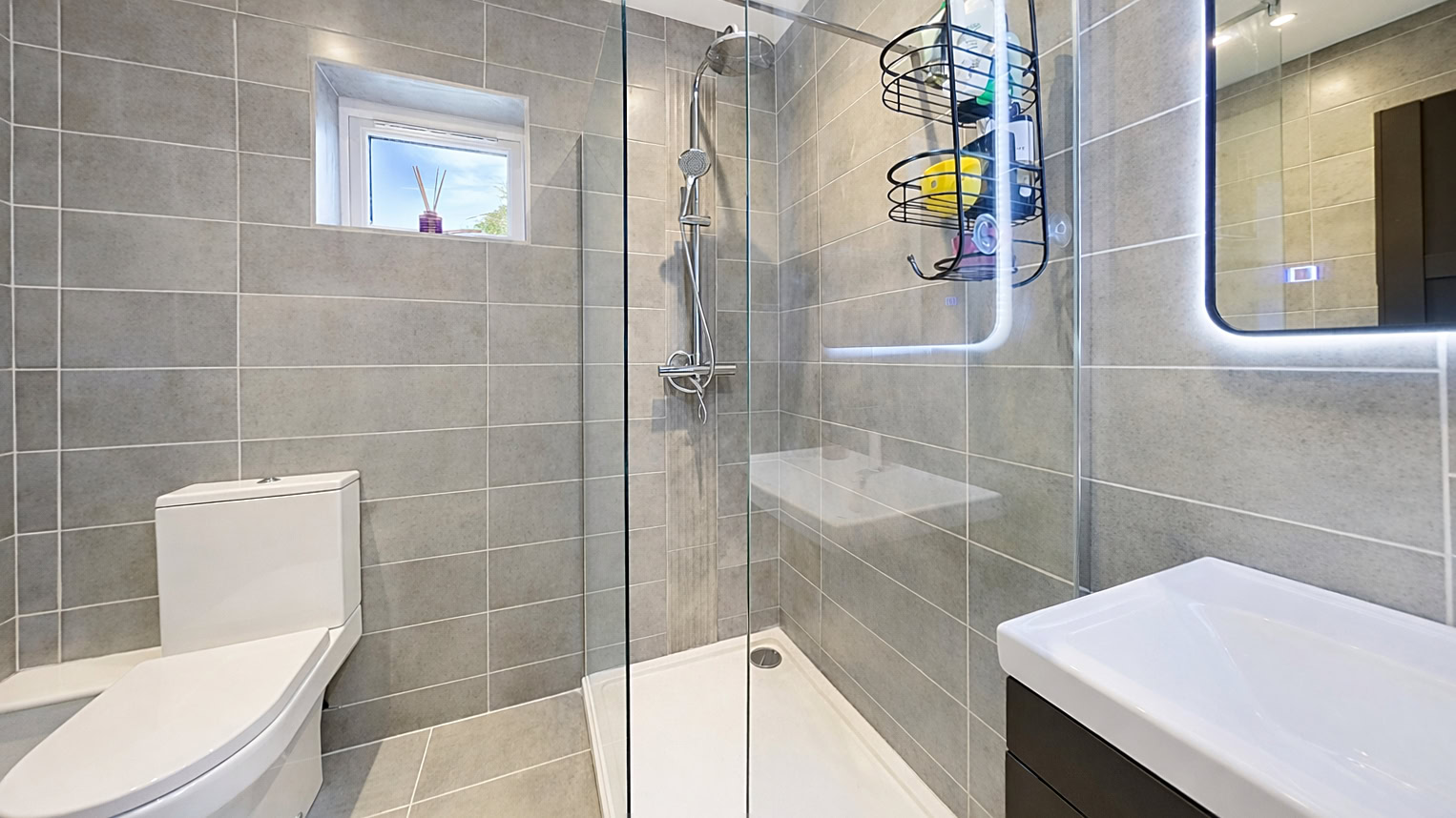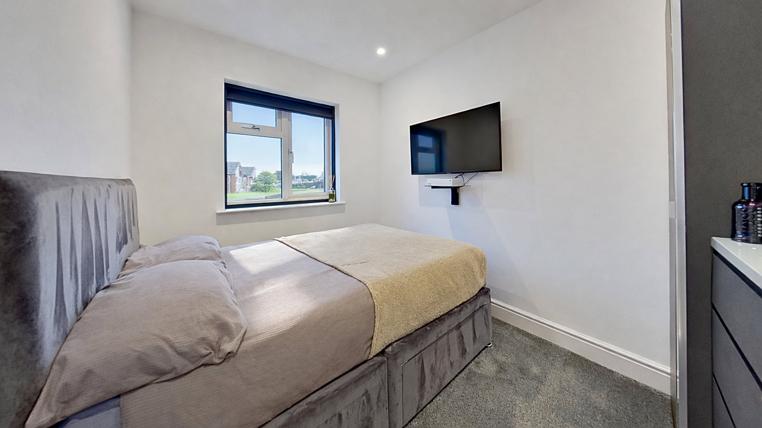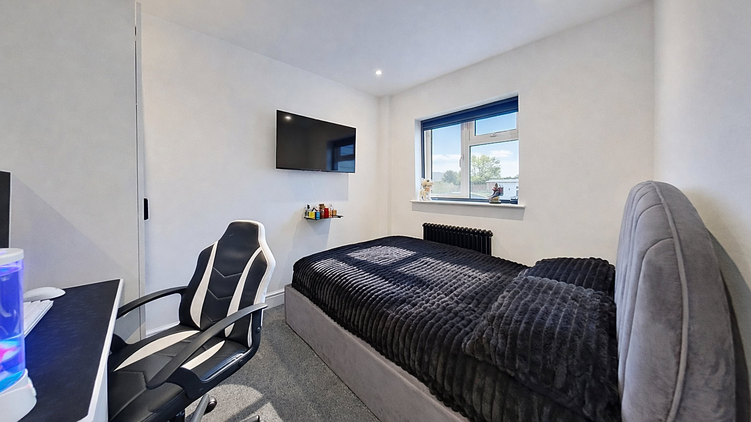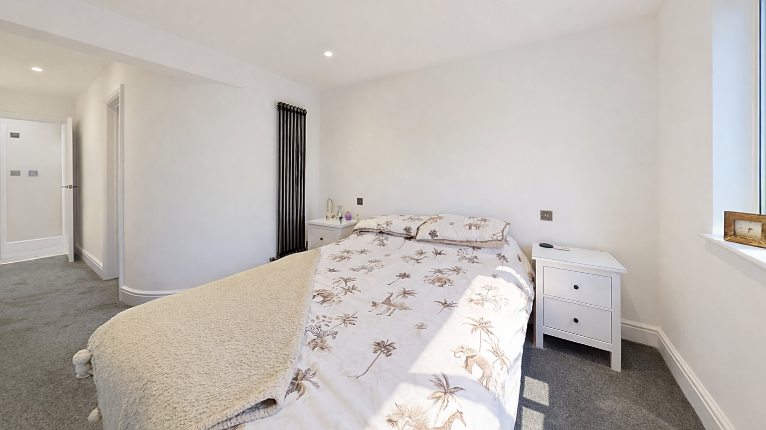 The principal bedroom is also located to the rear of the property and offers a peaceful retreat, complete with a walk-in wardrobe and a well-appointed en suite bathroom. There are two further double bedrooms to the front of the bungalow, along with a modern family shower room, making the layout equally suitable for families, downsizers or those seeking flexible accommodation.