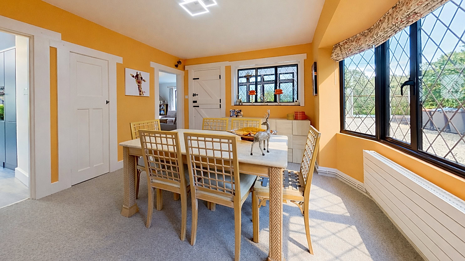 An entrance porch provides a practical welcome, with ample space for shoes and coats before stepping into the main accommodation. The property has been meticulously renovated and is presented in a modern, stylish finish throughout. The front door opens directly into a spacious dining room, a superb central hub of the home with plenty of room for a substantial table and chairs, ideal for both everyday living and hosting guests.