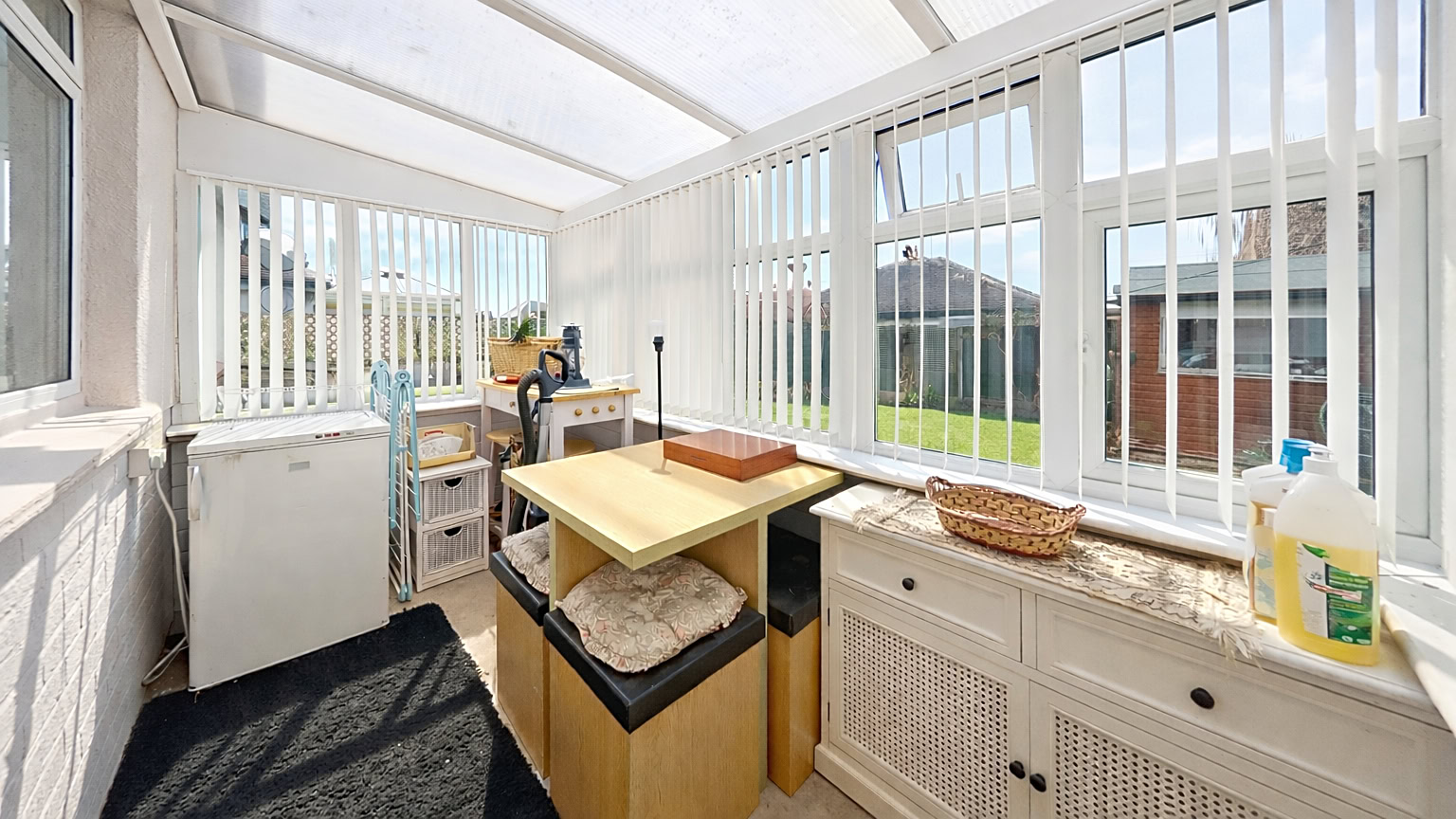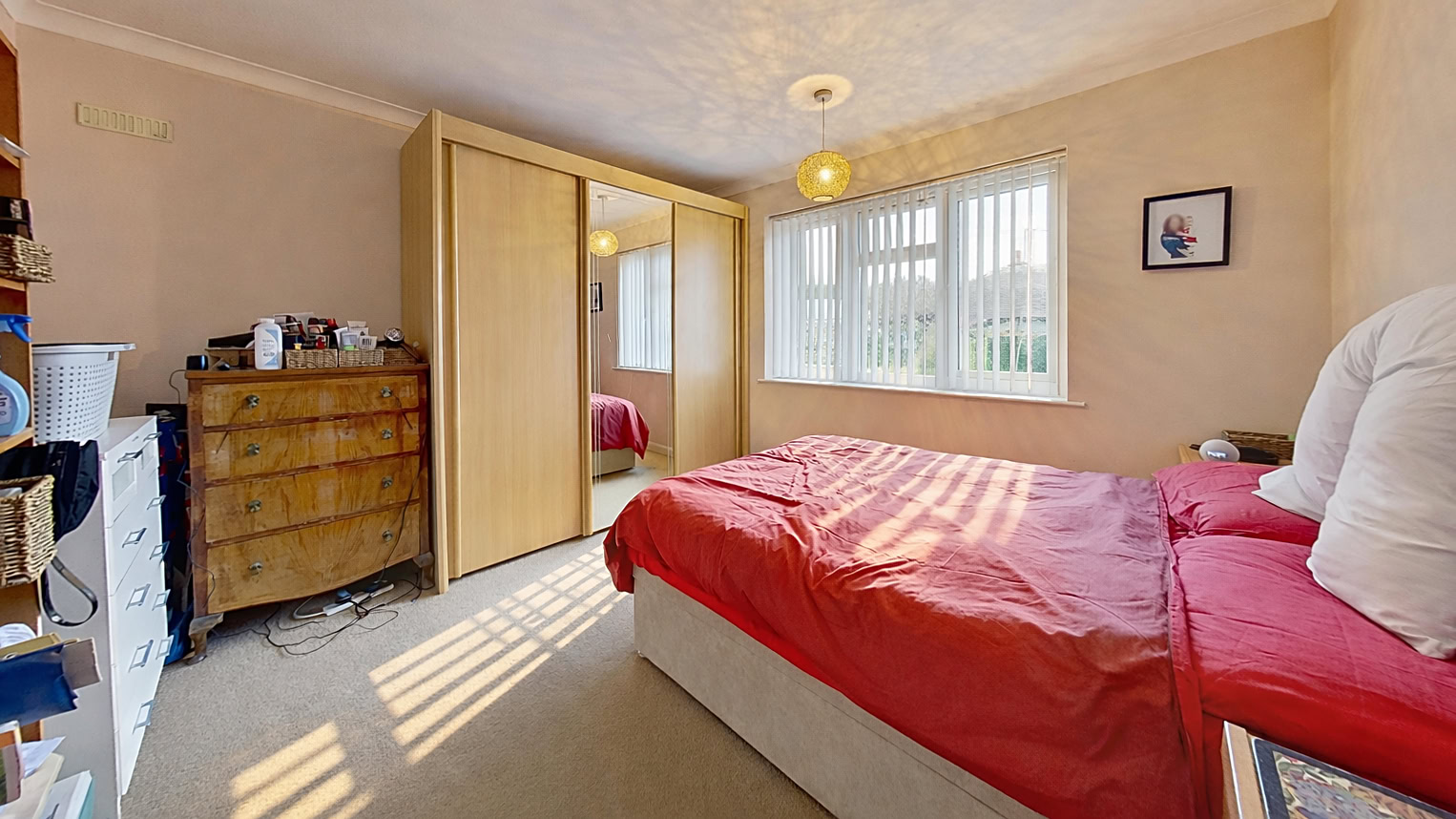 Internally, the property is bright and welcoming throughout. The lounge is positioned to the front of the bungalow and provides a comfortable living space, enhanced by a characterful wood burning fire that creates a warm focal point. Adjacent to the lounge is the second bedroom, also located at the front of the property, making it ideal for guests, a home office or additional reception space if required.