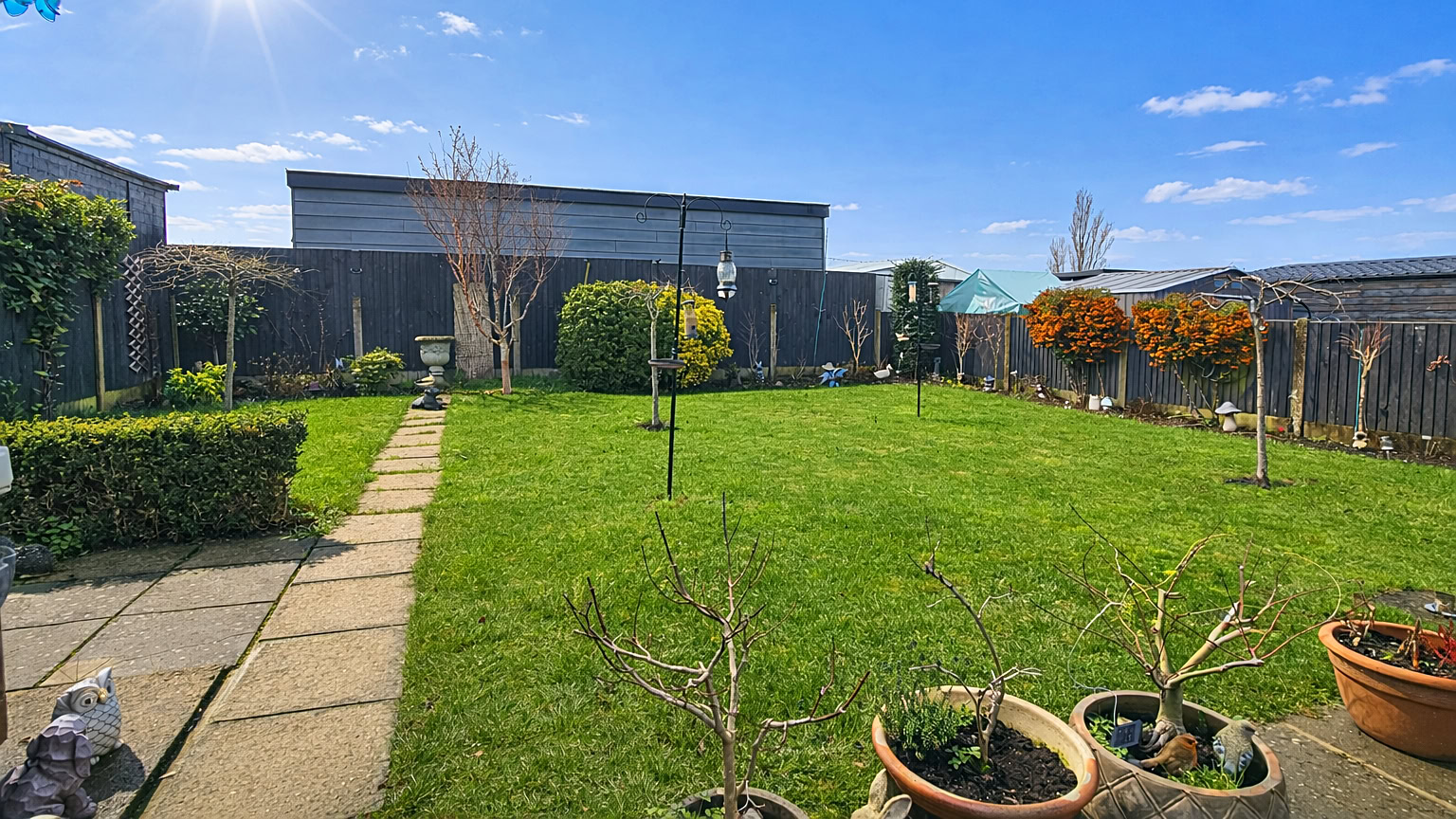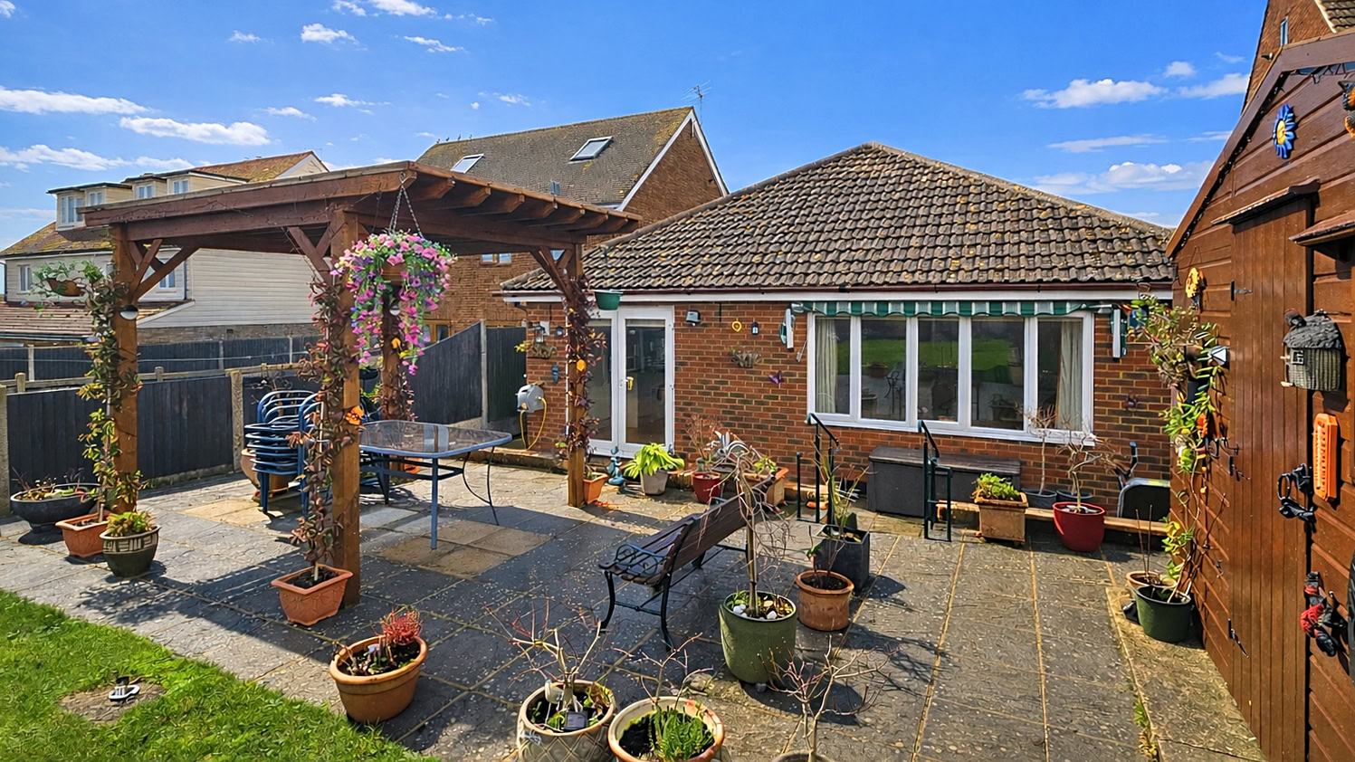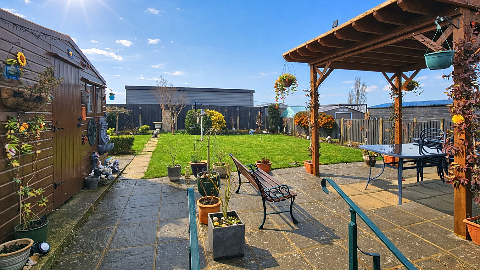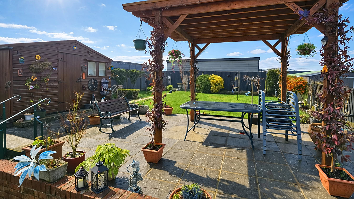 The rear garden itself is well maintained and thoughtfully landscaped, featuring a lovely pergola that offers a shaded seating area on the patio – an ideal spot to enjoy summer evenings. There is also a large shed providing excellent storage. To the front, a long driveway offers off-road parking for several vehicles, alongside a neat lawned area that adds to the property’s kerb appeal.