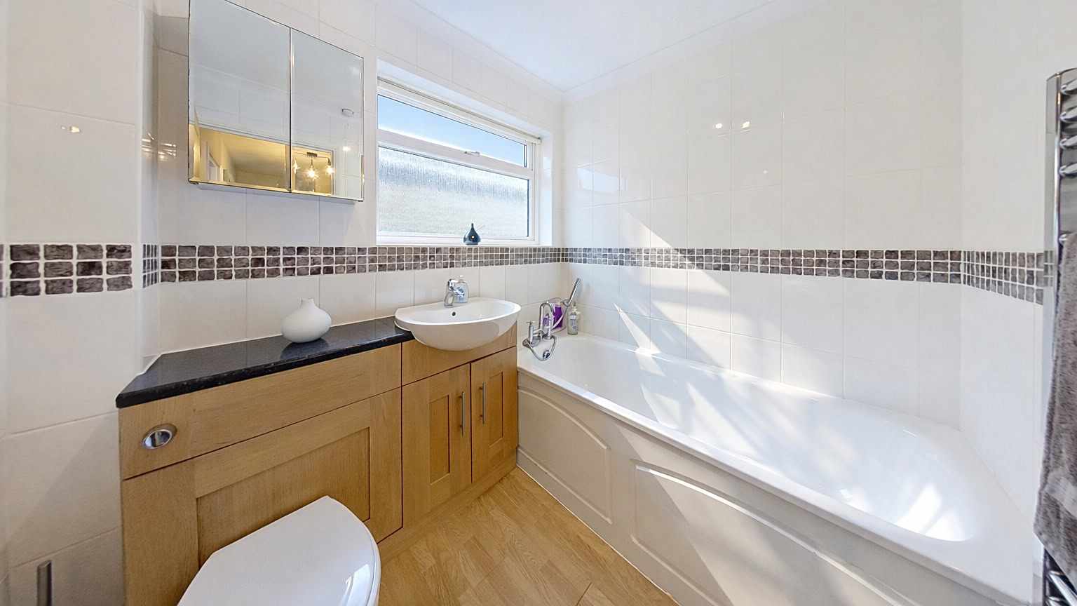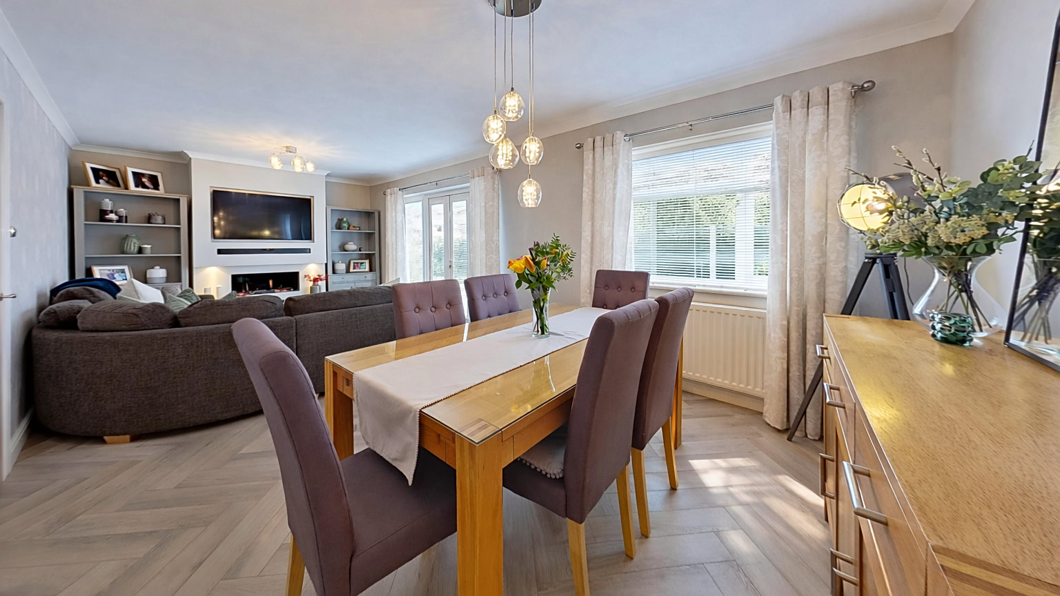 Upstairs, the first floor offers four well-proportioned bedrooms, making the property well suited to growing families. The main bedroom benefits from its own ensuite shower room and air conditioning unit, while the remaining bedrooms are served by a contemporary family bathroom.
